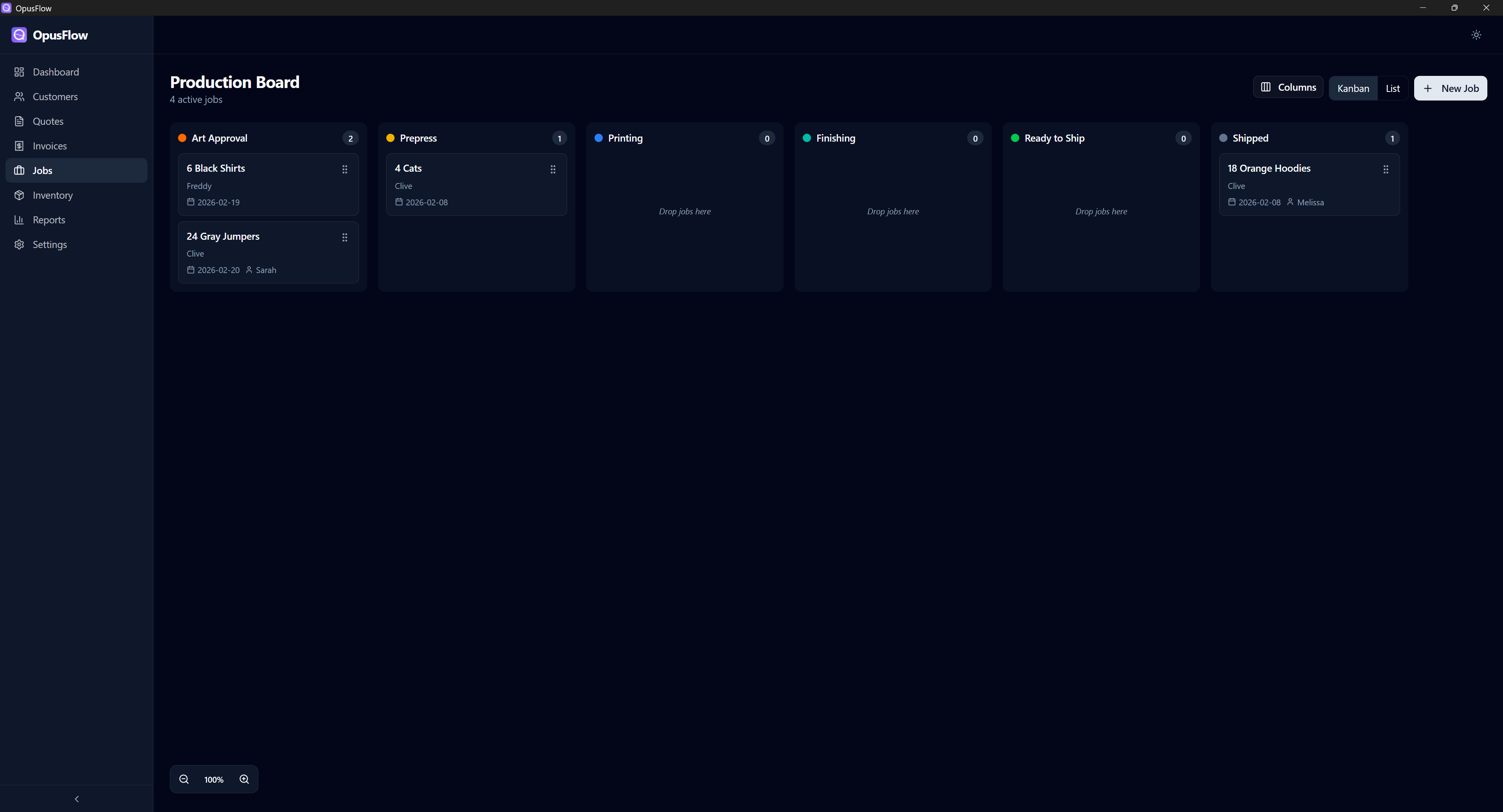 - Kanban-style production board (drag jobs from Art Approval → Printing → Finished)